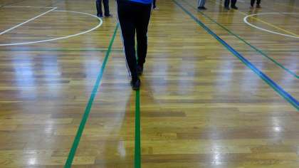 体育館のラインに沿って歩いている様子です。その時に、ラインを踏まず平行に足を出したり、逆にラインの上を歩いたりしました。体幹がしっかりしていないと、大人でもなかなかバランスよく長い時間、歩くことができませんでした。