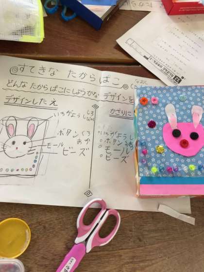 図画工作科の学習で、算数科でも使った箱を使って『すてきなたからばこ』を作りました。まず、設計図をかいてそれぞれ、その設計図に見合う飾りなどを、お家から持ってきて飾って作りました。