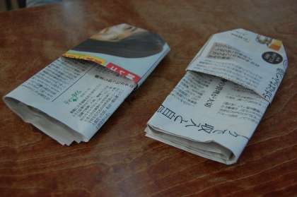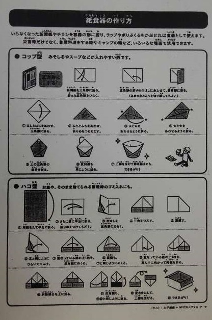 1年生から4年生は、防災学習のDVDを視聴した後、新聞紙を使ってスリッパや紙皿を作りました。