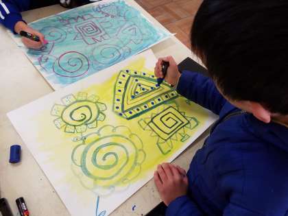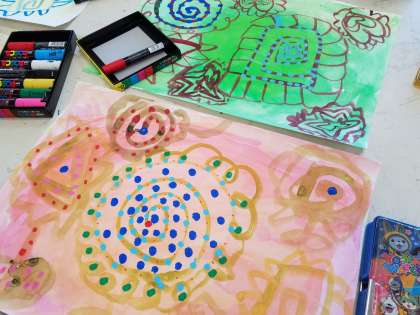 カラーペンを使って、今まで描いてきたふしぎな花に模様をつけました。