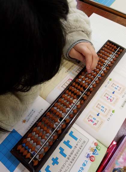 そろばんを初めて触る子も多く、そろばんの玉の置き方や読み方を1つ1つ学習していきました。