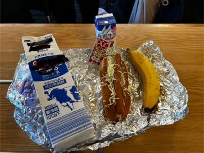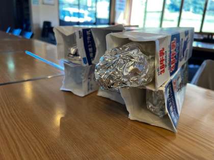 チーズ、キャベツをはさんだコッペパンを持参した牛乳パックに入れてこれから焼きます。