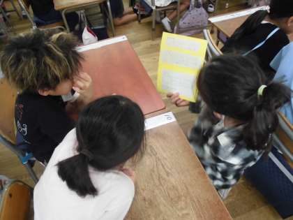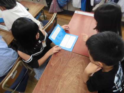 6月に3年生が見学させていただいた「まちかど号」のリーフレットを作り、1年生に向けて紹介をしました。1年生が読めるように、ひらがなと簡単な漢字を使って、丁寧に文を書きました。