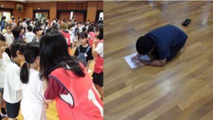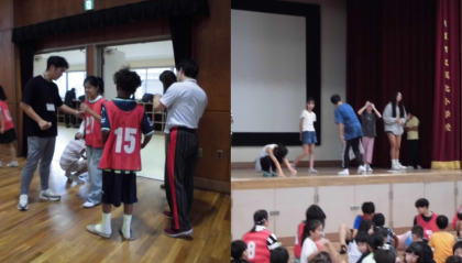 集会委員会がお題を伝え。高学年から順番に伝言しました。最後までたどり着いた時には、初めとは違う言葉になっていて、とても楽しく活動をすることができました。