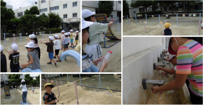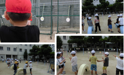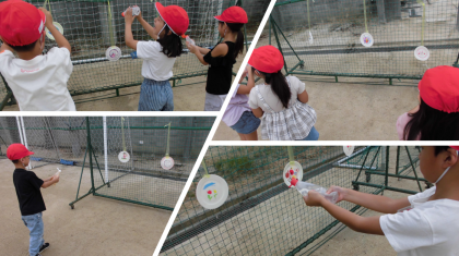 ご家庭で用意していただいたマヨネーズなどの空き容器を使って、的を狙います。