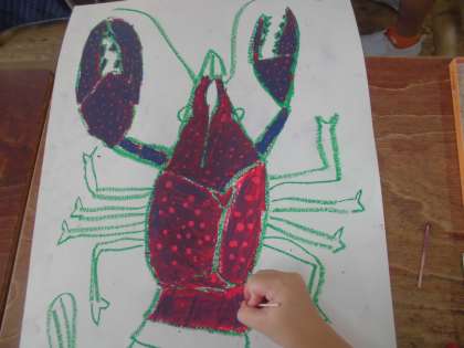 1学期にかわいがって育てていた、ザリガニのカワちゃんをパスで描きました。