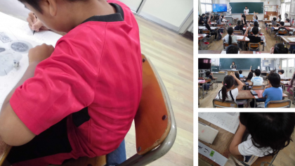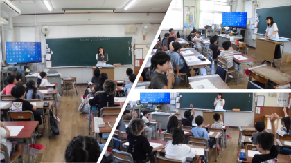 大宮小学校から栄養教諭をお招きし、栄養学習を行いました。今日は、食べ物の名前について学び、給食の献立を例にどんな食べ物が使われているのか考えました。