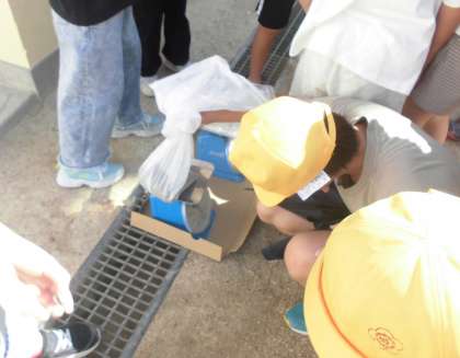 運動場に出て、グループで協力しながら1kgの重さになるように土を入れました。