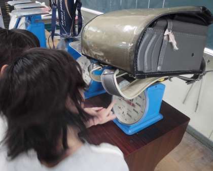 1kgの重さがどれくらいかを体感した後、教室にあるものの重さ調べをしました。1kgよりも重いか、軽いかで使うはかりを選ばなければいけません。「辞書は1kgくらいかな」「ランドセルは1kgより重いはず!」と予想しながら調べました。