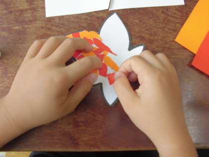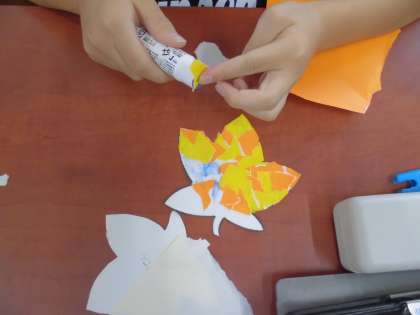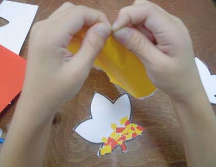 白画用紙をもみじの形に切り抜き、そこに赤や黄色など、自分で選んだ折り紙をちぎって貼り付けていきました。
