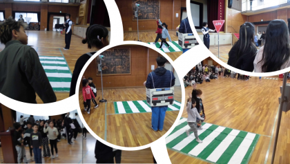 歩く時のルールをしっかり知らないと、自転車に乗るときのルールが分からないため、丁寧に教えていただきました。「歩道を歩く時は、建物に近いほうを歩く。」「渡る前に信号が点滅したら渡らない」など基本的なルールを確認した後、講堂内に作っていただいたコースを実際に歩いてみました。