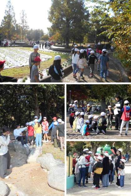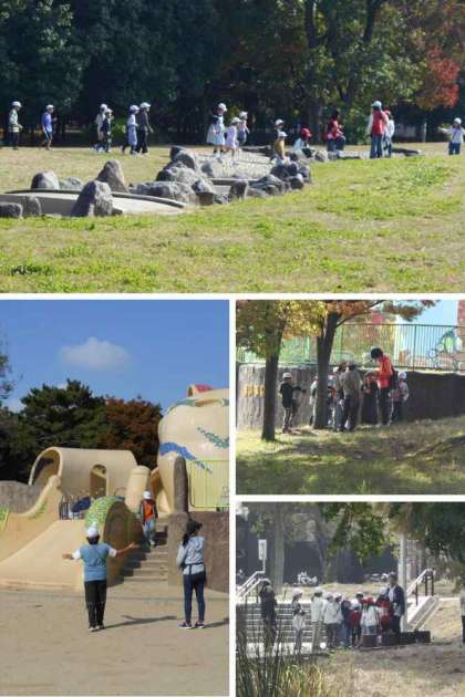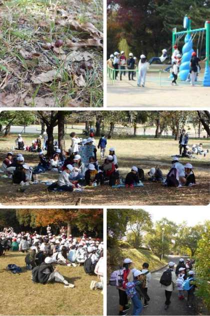 秋晴れの暖かい陽気の中、「久宝寺緑地公園」へ全校遠足に出かけました。公園では、たてわり班によるオリエンテーリングを行いました。