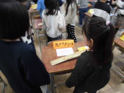 先週は1年生を、今週は2年生を招待して、作品で遊んでもらいました。自分の作ったコースのそばに立って、ビー玉を転がすコースの工夫をお話している子、「いらっしゃーい!」と元気に掛け声をかけている子、「ビー玉はここだよ」と案内係をしてくれる子、それぞれのやり方で低学年をおもてなしすることができました。