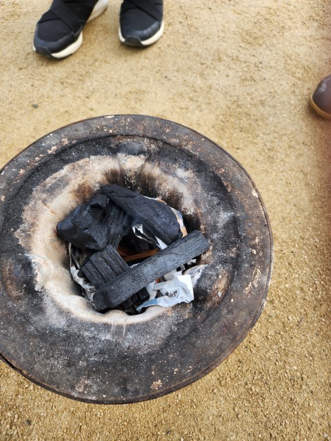 風通しの良い場所で、七輪についている風を通すための窓を開け、燃えやすい新聞紙、木切れを先に入れてから炭を入れます。炭に火が付くまではうちわで風を送り続けます。力を合わせてなんとか火をつけることができました。なかなか大変です。