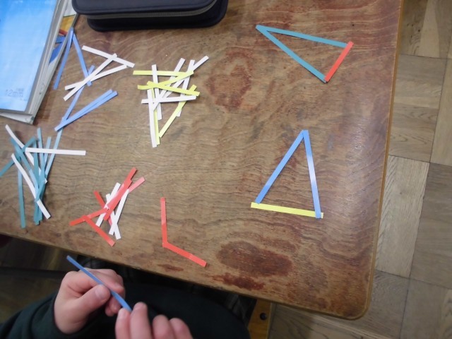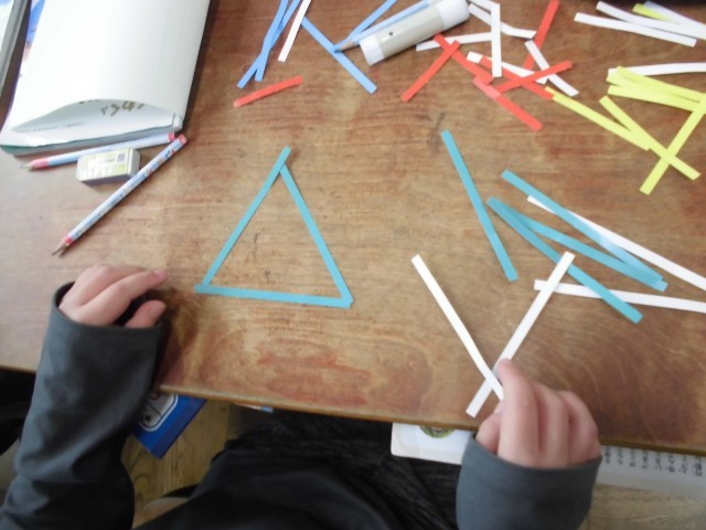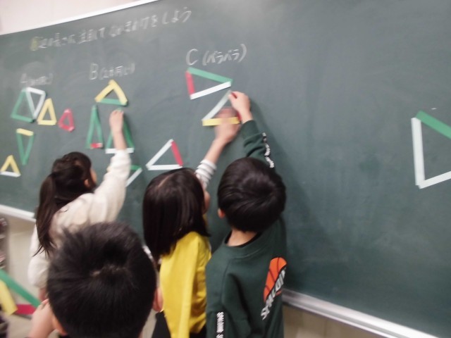 3学期はじめての算数では、三角形の学習に取り組みました。まずは一人で、長さの違う四色の棒を使って三角形を作りました。そのあとで、二人一組で作った三角形を黒板に貼り、辺の長さに注目して仲間分けをしました。
