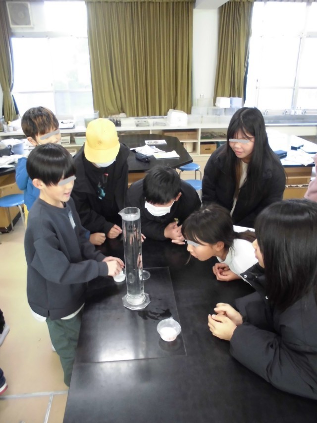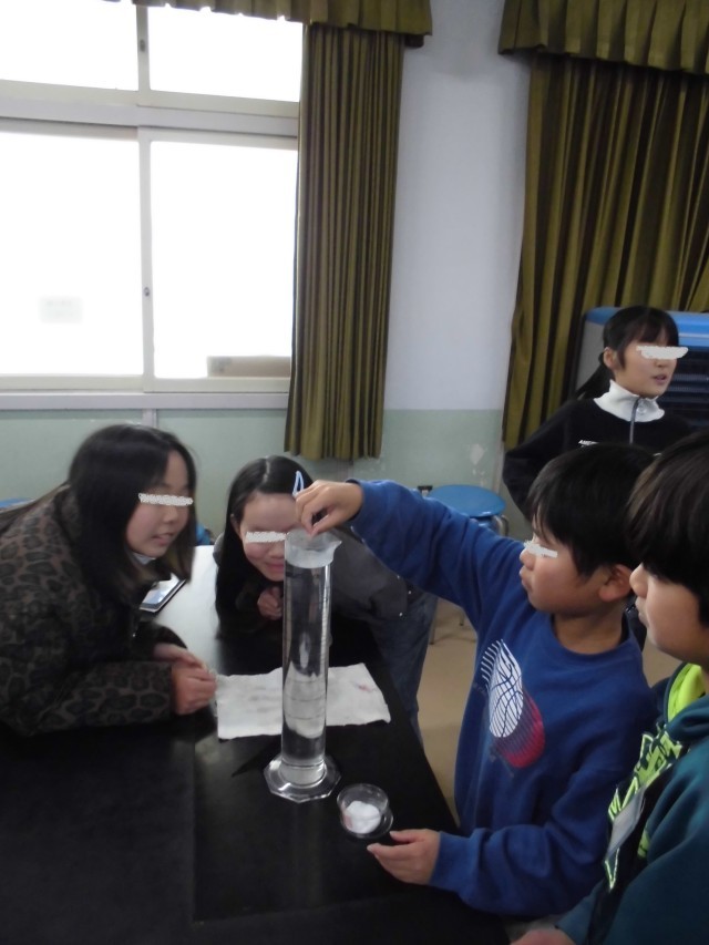 今日は、大きいシリンダーに水をたっぷり入れて、食塩が溶ける様子をみんなで観察しました。