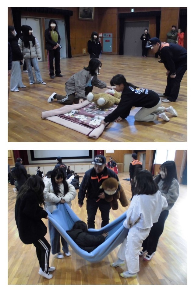 担架体験では、毛布を使ってけがをした人や体調の悪い人を運ぶ方法を教えてもらいました。最初はぬいぐるみで、そのあとは実際に人をのせてみました。大人(先生)でも、みんなで力を合わせれば、運ぶことができました。
