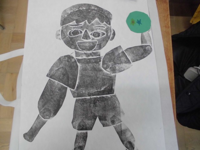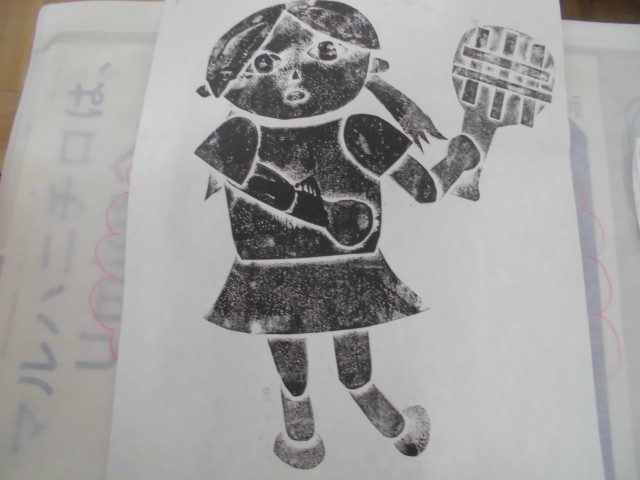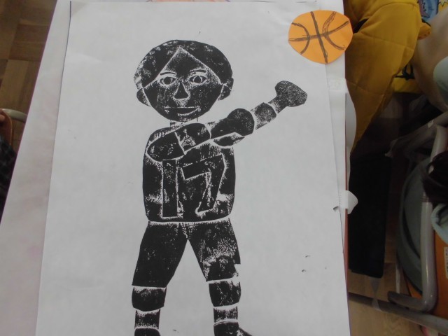 しっかりインクがつくように、慎重にバレンでこすり、きれいに刷り上がりました。ドッジボールや縄跳び、テニス、バスケットボールなど、いろいろなスポーツをしているところができました。持って帰った作品袋に入っているので、ぜひじっくりお家で鑑賞してください。