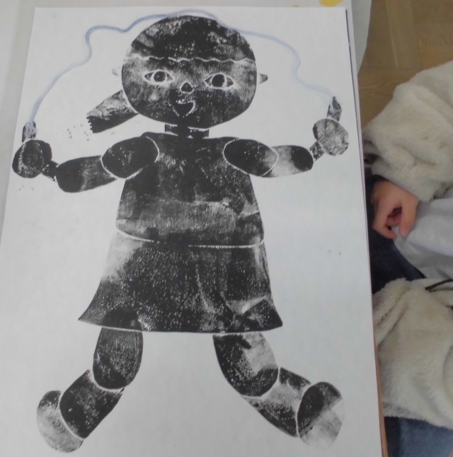 「走っているからもう少し足を曲げようかな。」「シュートさせたいから、ここは体と腕が重なるな。」「縄跳びをしているから、足は思い切り曲げよう。手はどうしたら跳んでるように見えるかな。」「数字は反対に貼らないと、刷ったらおかしくなっちゃう。」など、それぞれが考えながら「わたし」の形を作りました。とてもよい感じでできていたので、インクをつけて上手く刷れるように頑張ります。