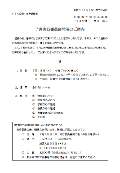 7月PTA実行委員会開催のご案内 7月4日(木)