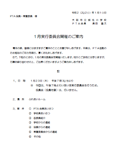 1月PTA実行委員会開催のご案内 1月10日(金)