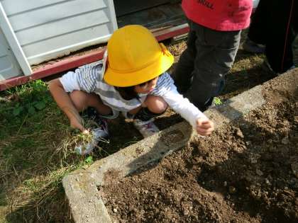 最初に草抜きをしました。畑がきれいになったので、次は畝を作りました。みんなで協力してキャベツの苗を植えました。
