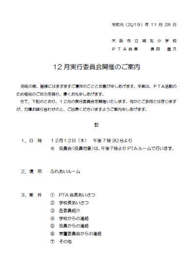 12月PTA実行委員会開催のご案内 11月28日(木)
