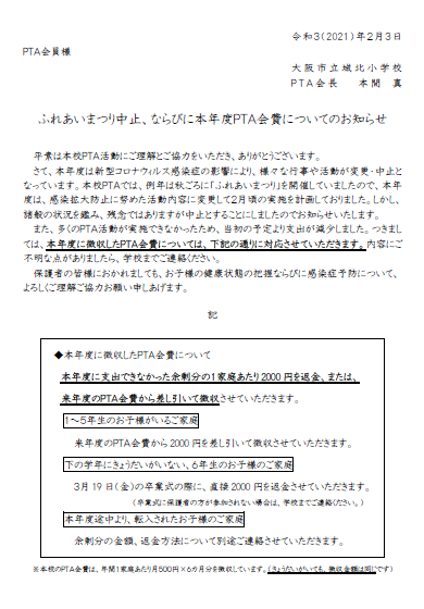 ふれあいまつり中止、ならびに本年度PTA会費についてのお知らせ