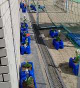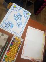 画用紙にパスでお皿を描き、その中にお花を咲かせました。絵の具でお花のまわりに色...