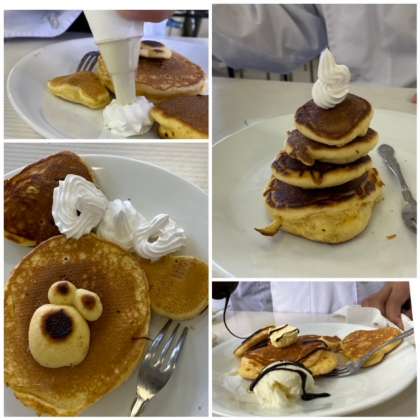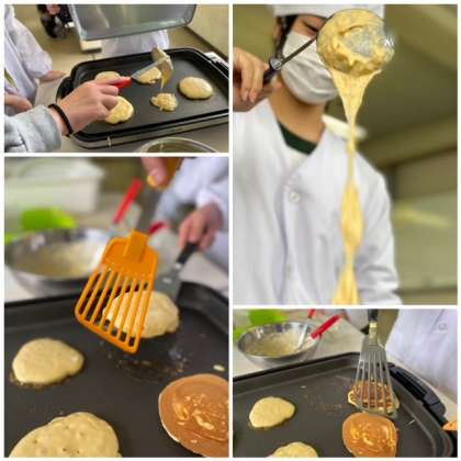 先生の話をよく聞いて、ふっくらしたホットケーキをつくりました。 -