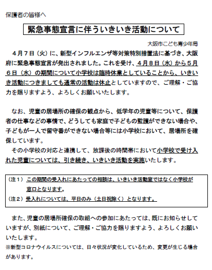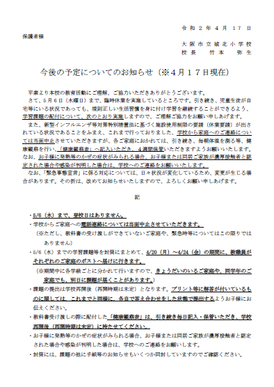 保護者の皆様 今般の新型コロナウイルス感染症の拡大予防に向けた臨時休業にご理解...
