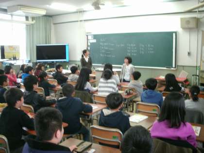 5年生の外国語活動が始まりました。C-NETのミシェル先生の自己紹介を聞き、それを真似て、じぶんの自己紹介をしていました。