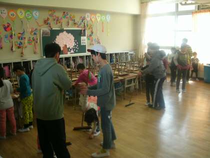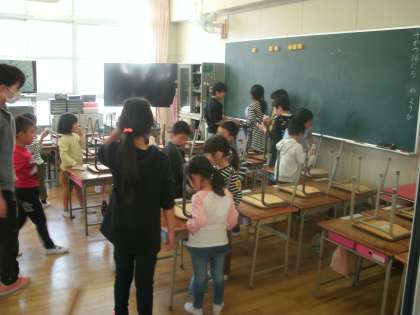 1年生もそうじが始まりました。そこで、6年生が1年生のそうじを手伝い、教えに来てくれています。5年前に自分たちも6年生に教えてもらったことを思い出し、優しく丁寧に教えていました。1年生もお兄さんお姉さんの真似をして一生懸命そうじをしていました。