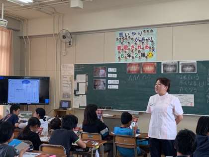 5月10日(金)、6年生を対象に「歯と口の健康教室」を実施しました。歯科衛生士の方に来ていただき、歯を健康に保つことやしっかりかむことの大切さを教えていただきました。