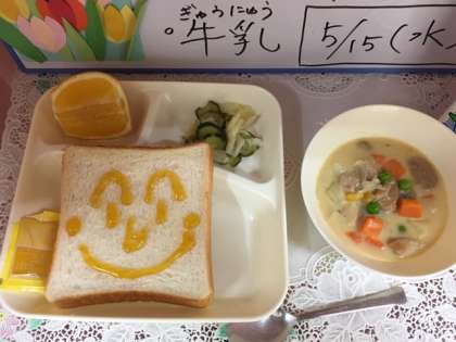 今日の給食は『コーンクリームシチュー、キャベツときゅうりのサラダ、かわちばんかん、食パン、アプリコットジャム、牛乳』です。