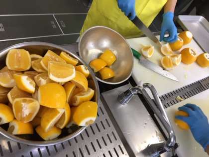ほんのり甘く、ほろ苦い後味で爽やかな味わいが特徴。和製グレープフルーツともよばれています。果皮にツヤがあり、傷が無くずっしりとした重いものが美味しいとされています。給食では一人1/4切れなので、新森小路小学校では今日156個のかわちばんかんを使用しました。