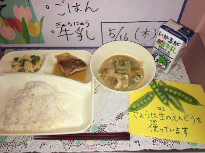 今日の給食は『ごはん、牛乳、あかうおのしょうゆだれかけ、みそ汁、えんどうの卵とじ』でした。