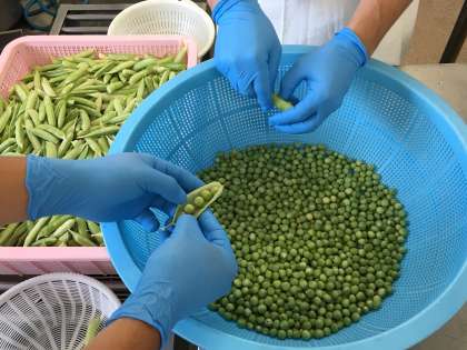 給食ではふだん冷凍のものを使用していますが、今日は和歌山県産の新鮮なえんどう(グリンピース)をさやから出して調理しています。