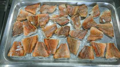 赤魚は、児童に大変好評な魚のひとつです。塩で下味をつけてコンベクションオーブンで蒸し焼きにしたものに、料理酒・みりん・うすくちしょうゆをあわせて煮たタレをかけています。