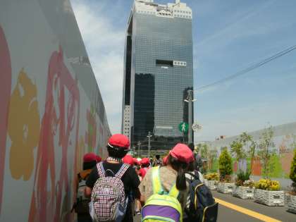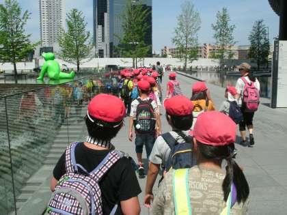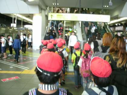 3年生は、校外学習として、梅田のスカイビルの空中庭園に行き、その後、環状線を一周しました。大阪駅では、たくさんの人が行き来している中を、前の子を探しながら列についていこうと必死でした。