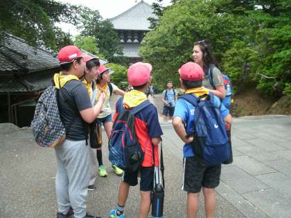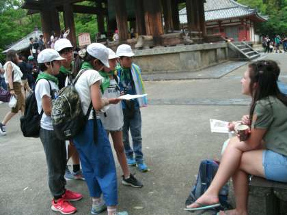 オリエンテーリングのルールで、外国人観光客の方々に声をかけました。ふだん学習している英語を使って、台本をもとにお話をさせてもらいました。どの外国の方も優しく迎えて下さり、子どもたちの話に耳を傾け、返答してくださりました。