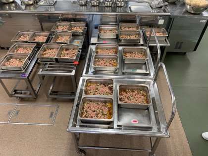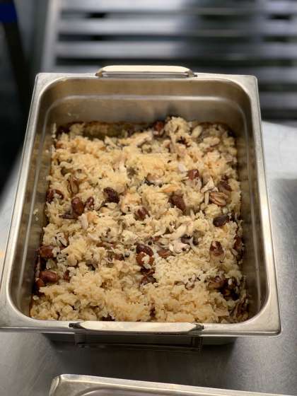 もち米と金時豆、鶏肉やシメジなどの材料と料理酒・塩コショウ・しょうゆ・チキンブイヨン・ごま油を合わせた調味液をクラスごとにミニバットに入れて、コンベクションオーブンで蒸し焼きにしています。