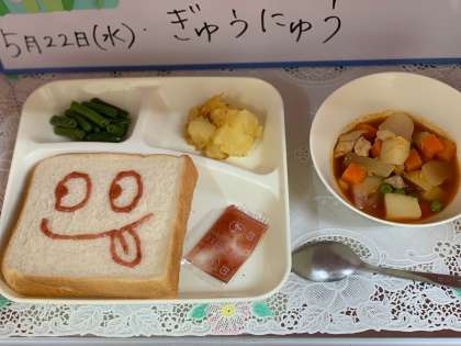 今日の給食は『食パン、牛乳、ケチャップ煮、さんどまめのソテー、りんごのクラフティ、いちごジャム』でした。