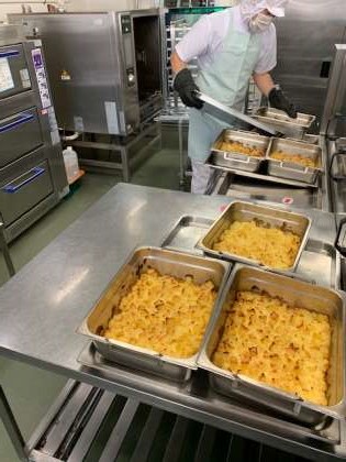 クラフティとは、フルーツ・卵・小麦粉・砂糖・クリームなどを混ぜて焼き上げたフランスの伝統菓子です。給食では、ミニバットという深型の容器にコーンフレークを底にしき、卵・クリーム・小麦粉・砂糖・カットされたリンゴ(缶)を混ぜた生地を流しいれて、コンベクションオーブンで蒸し焼きにしています。