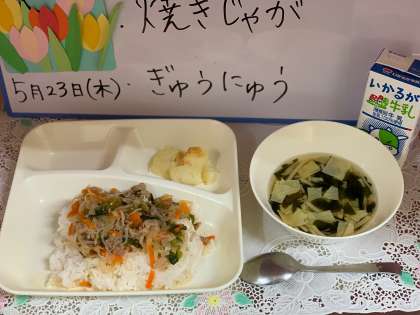 今日の給食は『豚丼、湯葉のすまし汁、焼きじゃが、牛乳』でした。