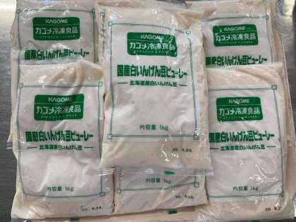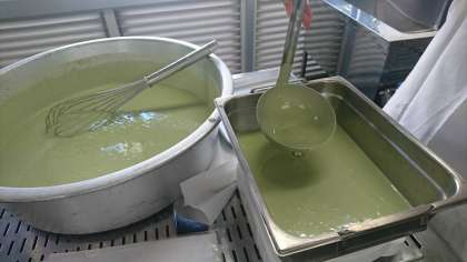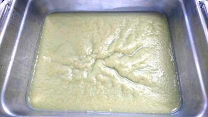 今日の給食のまっちゃういろうは、上新粉(うるち米をひいた細かい粉)、抹茶、砂糖、水と白いんげんのペーストを加えて、良く混ぜた後、クラスごとのバットに入れて、コンベクションオーブンで30分蒸しています。