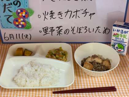 今日の給食は『ごはん、牛乳、すき焼き煮、焼きかぼちゃ、野菜のそぼろいため』でした。