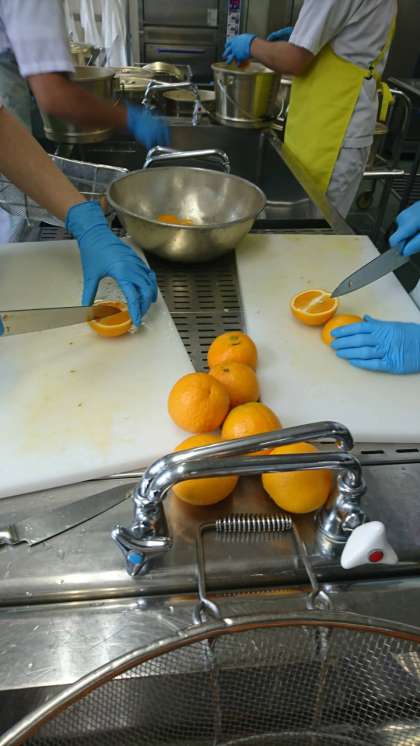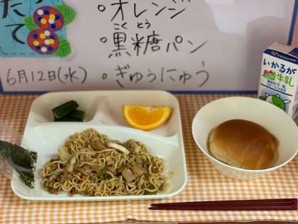 今日の給食は『黒糖パン、焼きそば、オクラのかつお梅風味、オレンジ』でした。