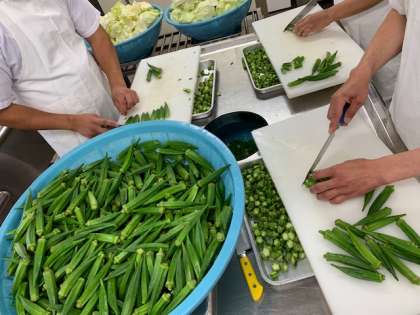 コンベクションオーブンで蒸したオクラを、かつおぶしの粉末と梅肉・砂糖・酢・うすくちしょうゆを合わせて煮たものと和えています。