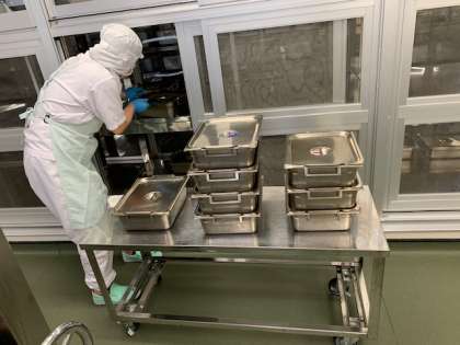 「鶏肉のしょうゆバター焼き」を配缶した後、クラス順に配膳棚に置いていきます。